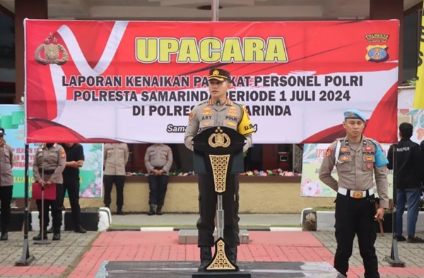 SAMARINDA – Sebanyak 37 personel Polresta Samarinda menerima kenaikan pangkat dalam sebuah upacara berlangsung di lapangan apel Mako Polresta Samarinda Selasa, 2 Juli 2024.