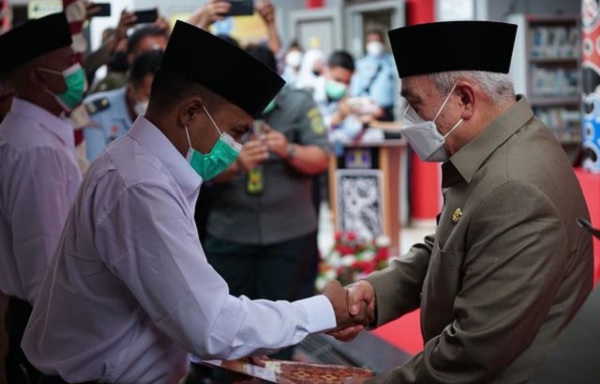 Gubernur Kaltim, Isran Noor didampingi Wagub Kaltim H Hadi Mulyadi, dan Kepala Kanwil Kemenkum HAM Kaltimtara Sofyan, menyerahkan secara simbolis surat remisi umum tersebut di Lapas Kelas IIA Samarinda, Selasa (16/8/2022).