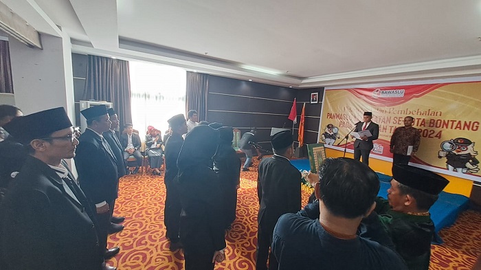 PRANALA.CO – Badan Pengawas Pemilihan Umum alias Bawaslu Bontang melantik dan mengambil sumpah janji 9 anggota Pengawas Pemilu atau Panwaslu Kecamatan, di Hotel Bintang Sintuk, Jumat, 24 Mei 2024.