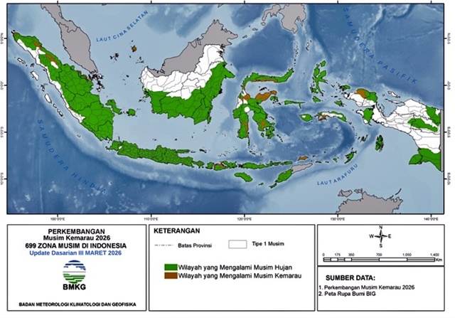 JAKARTA, Pranala.co – Badan Meteorologi, Klimatologi, dan Geofisika (BMKG) mencatat tanda-tanda awal musim kemarau 2026 mulai muncul di sejumlah wilayah Indonesia. Hingga akhir Maret 2026, sekitar 7 persen Zona Musim (ZOM) telah memasuki periode kemarau.