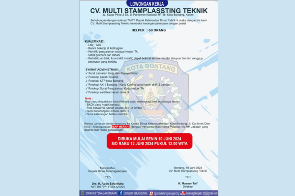 BONTANG – PT Pupuk Kaltim melalui CV Multi Stamplassting Teknik membuka lowongan kerja untuk masyarakat Bontang yang akan ditempatkan di TA Pabrik 4 posisi helper.