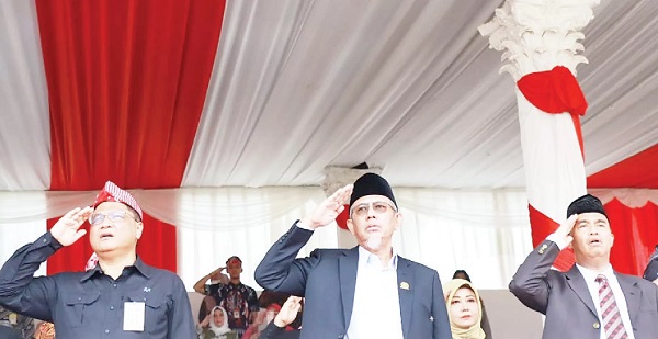 MEWAKILI Pimpinan DPRD Kaltim, Anggota DPRD Kaltim Kaharuddin Jafar dan Harun Al Rasyid menghadiri Upacara Peringatan Hari Ulang Tahun (HUT) ke-24 Kota Bontang di Stadion Bessai Berintai, Bontang, Kamis (12/10/2023).