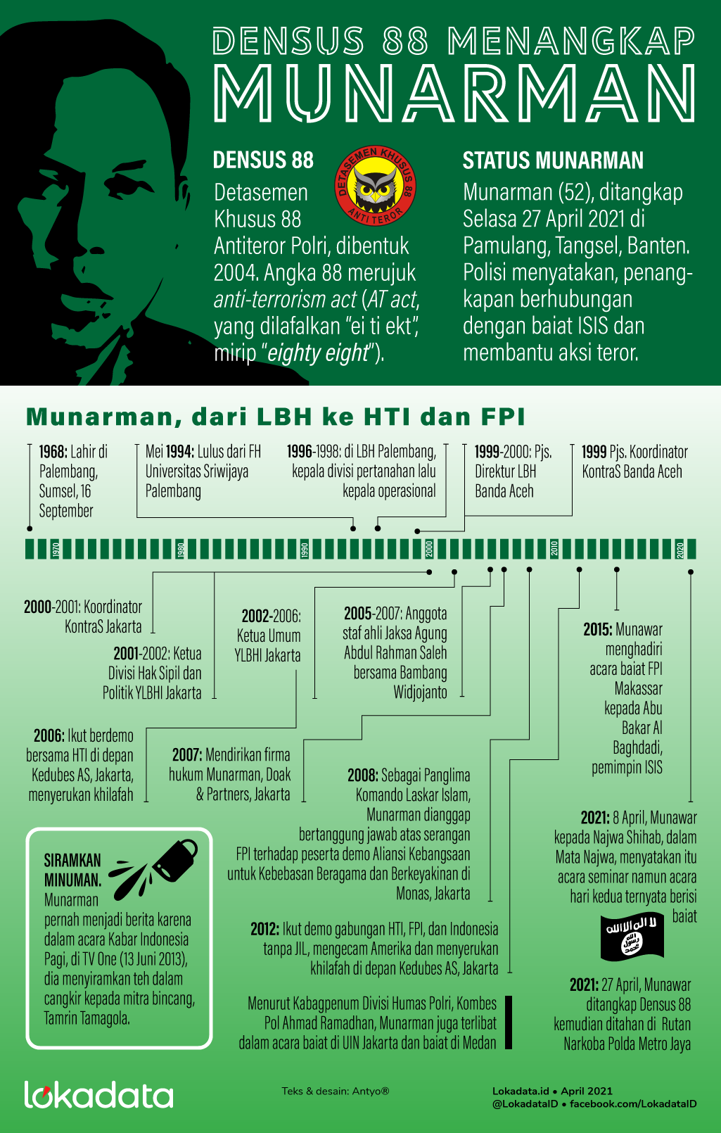 PENANGKAPAN Munarman, salah satu tokoh Front Pembela Islam (FPI — dia pernah menjadi sekretaris umum), di Pamulang, Tangerang, Banten, Selasa (27/4), karena sangkaan polisi bahwa dia terlibat baiat kepada pemipin ISIS.