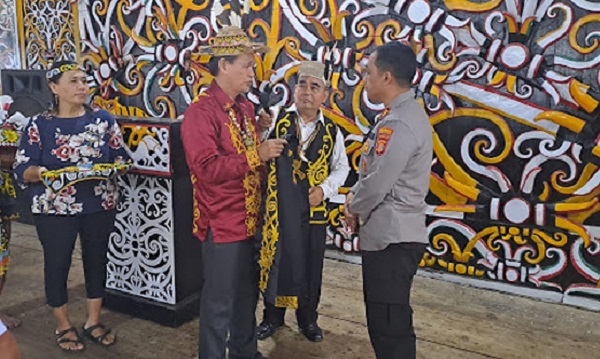 Serangkaian prosesi adat mulai dari pemakaian baju kebesaran, kalung, topi khas Dayak dan mandau yang diserahkan Esrom Palan selaku kepala adat kepada AKP Noor Dhianto.