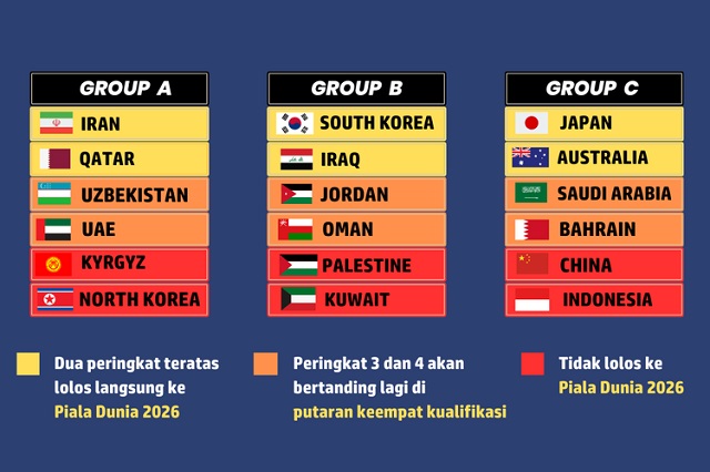 Drawing pembagian grup ini dilakukan di markas Federasi Sepakbola Asia (AFC) di Kuala Lumpur, Malaysia, pada Kamis (27/6). Berdasarkan hasil undian tersebut, Timnas Indonesia tergabung di Grup C bersama tim-tim raksasa Asia: Jepang, Australia, Arab Saudi, Bahrain, dan China.