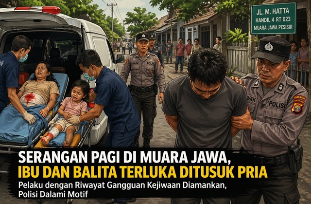 PAGI itu baru saja dimulai di Muara Jawa. Aktivitas warga berjalan seperti biasa—hingga seorang ibu dan anak balitanya tiba-tiba diserang dengan senjata tajam. Peristiwa penganiayaan itu terjadi di Jalan M. Hatta, Handil 4, RT 023, Kelurahan Muara Jawa Pesisir, Kecamatan Muara Jawa, Rabu (22/4/2026) sekira pukul 08.00 WITA.