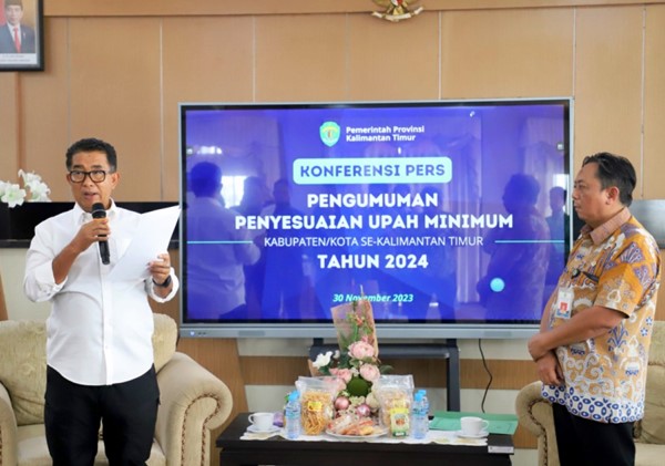 Pj GUBERNUR Kalimantan Timur, Akmal Malik mengumumkan penetapan Upah Minimum Kabupaten/Kota se-Kalimantan Timur untuk tahun 2024 dalam sebuah konferensi pers di Ruang VVIP Rumah Jabatan Gubernur Kaltim, Kamis (30/11/ 2023).