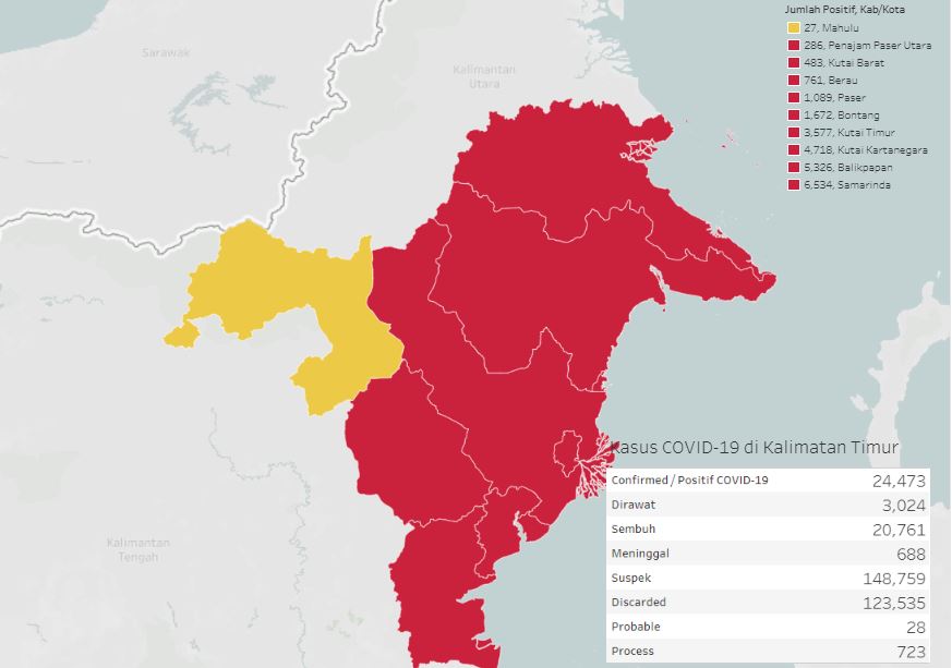 Dinas Kesehatan Kaltim telah menetapkan kriteria zona merah merupakan daerah dengan jumlah kasus aktif di atas 51 orang. Dari data Satgas COVID-19 Kaltim, saat ini Kutai Kartanegara merupakan kabupaten yang merawat kasus corona paling banyak. Jumlahnya mendekati seribu pasien, persisnya 955 kasus.